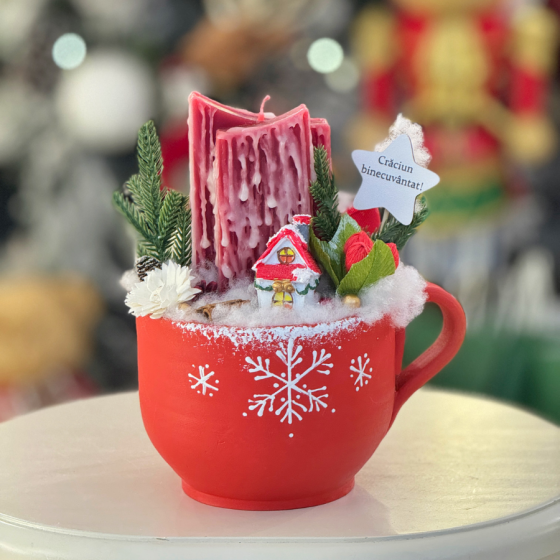 Un aranjament de Crăciun adorabil și plin de personalitate, realizat într-o ceașcă roșie decorată cu motive festive, completat...